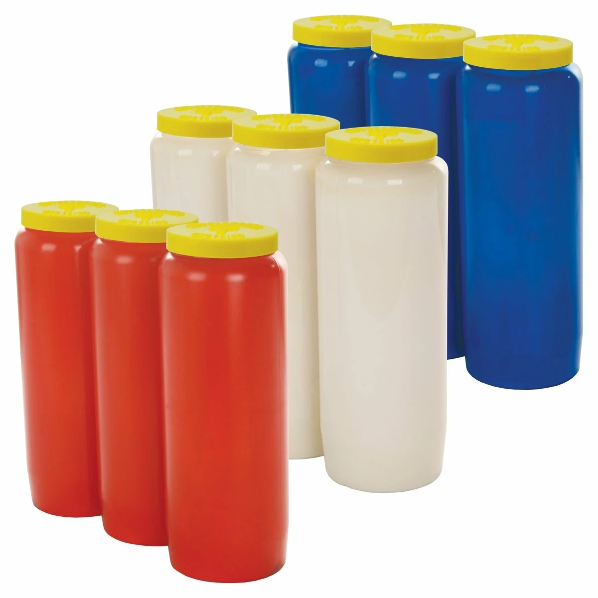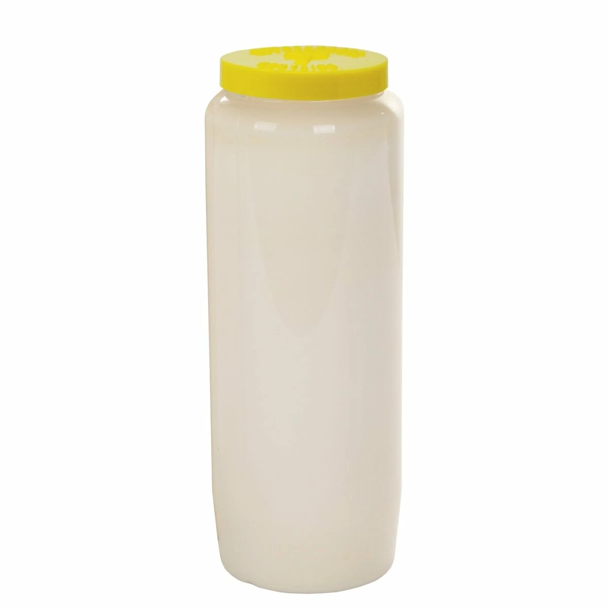We have tall sanctuary candles in plastic tubs that burn for up to 9 days!