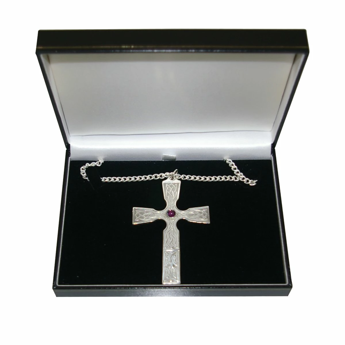 Made from solid silver, the cross features a intricate Celtic design and is set with a dazzling amethyst in the centre.