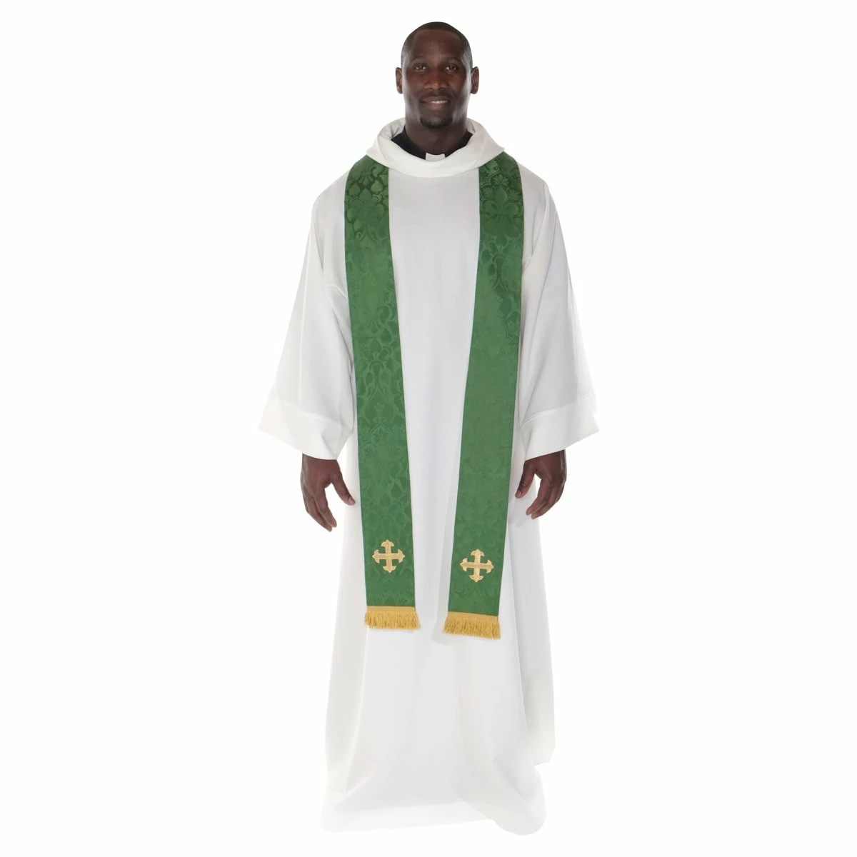 Made from washable polyester Jude fabric, this alb features a hooded cowl neckline and deep cuffs. It’s available in white or cream in length sizes 52″ – 62, making it perfect for any body type.