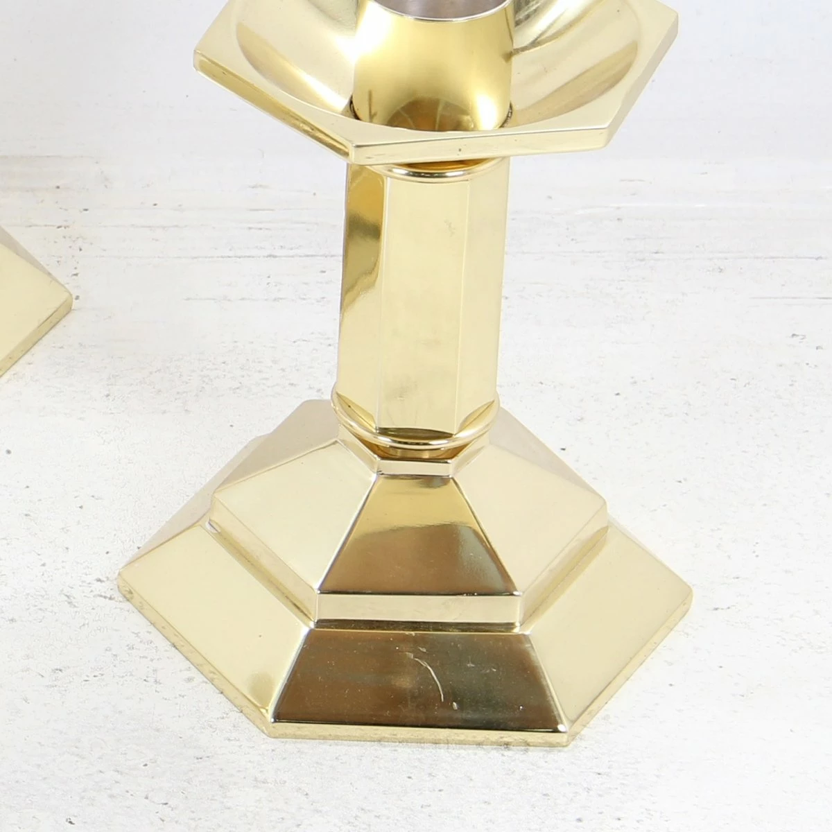 Altar crucifix and 2 candlesticks set made in polished brass, featuring a ornate design and three-legged base.