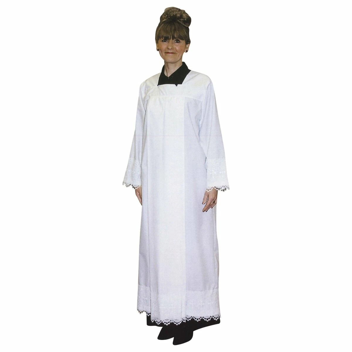 Featuring a square neck, deep pleated detail front and back, and trimmed with deep edging lace on sleeve ends and hemline.