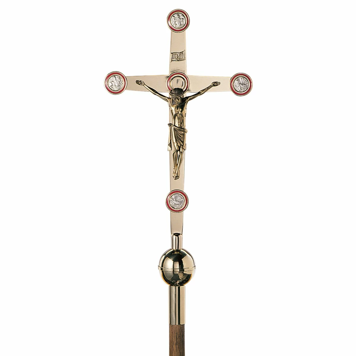 Processional cross made in polished brass, featuring red and silver plate Evangelist motifs.