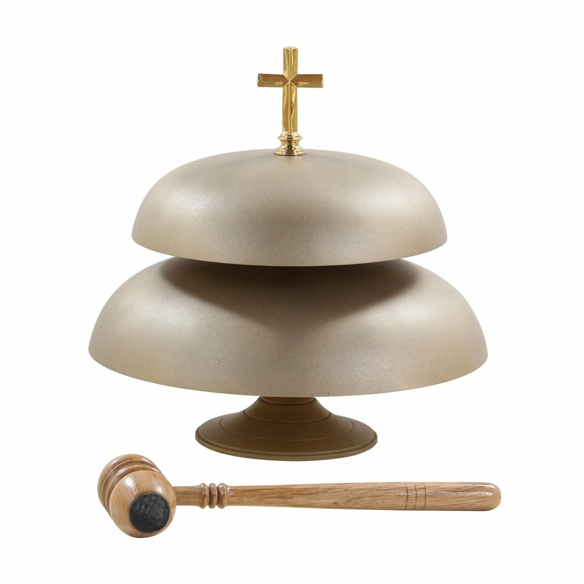 Double gong made in polished brass with satin brass dome design and tall cross top.